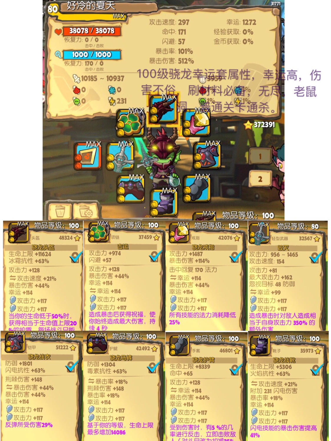 1、骁龙套装,装备名称前带骁龙两字的100级新装备,现阶段可以在第五层老鼠洞的地精商人处花400神圣碎片购买,后期老鼠洞关闭后只能在无尽模式里购买。